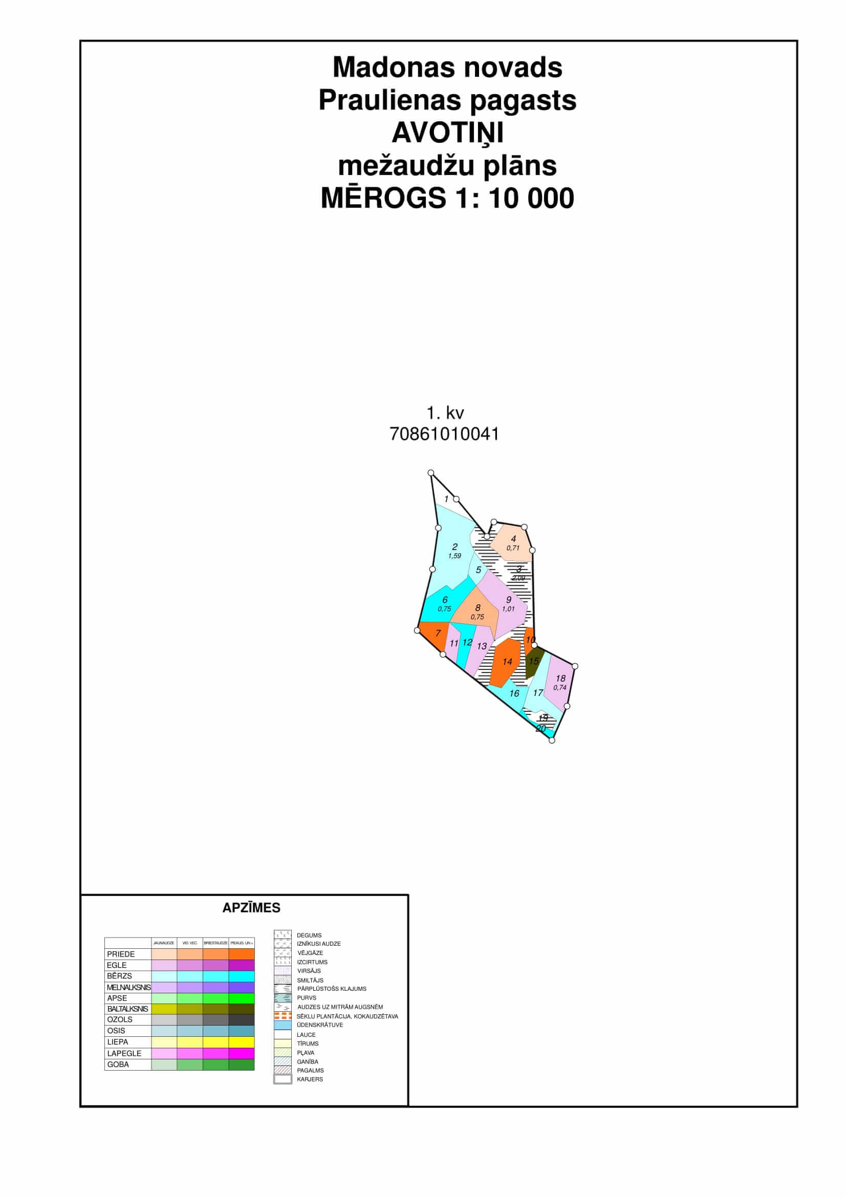 - Plāns ar uzzīmētajiem numurētiem meža nogabaliem, kā arī plānā iezīmētiem ceļiem (vasaras vai ziemas, pagasta, u.c.), grāvjiem (susinātājgrāvis, novadgrāvis u.c.), upēm, strautiem, pļavām u.c.